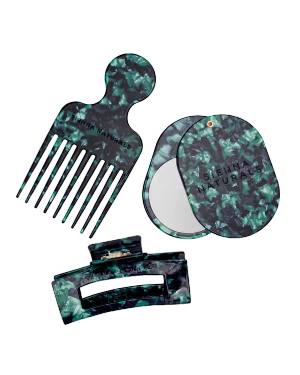 Give lift and volume to your curls; wear an impromptu updo, and check out your look from every angle. Made from recycled acetate with logo engraved, this set has a glossy finish that's beautiful on your vanity and convenient on the go. Includes claw, puff pick and mirror Dimension: Claw: 4" x 1.5", Pick: 5.75"x2.875", Mirror: 4"x2.75'