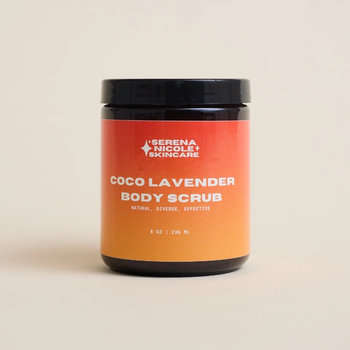 Castile soap, Cane Sugar, Epsom Salt, Coconut Oil, Lavender Essential Oil. Our body scrub is perfect for simultaneously exfoliating and hydrating your skin -- resulting in a soft, natural glow.