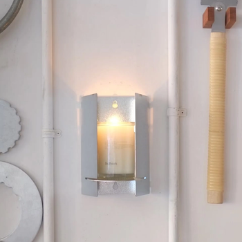 This wall mounted candle holder is inspired from left over components from our wall sconces. Please be careful of sharp edges when folding or handling.
