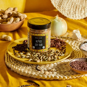This distinct aromatic and versatile spice rub adds delicious flavor to every meat and vegetable. This essential seasoning offers a subtle blend of Asian and West-African spices rounding off with fragrant notes of West-African peanuts. Try Mekko Dry Rub on fish, lamb, chicken, shrimp or beef. Try it in Olive Oil for yummy dipping or on popcorn or crackers for a savory, healthy snack.