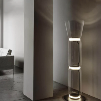 Powered by LED technology Dimmable lamp (controls provided in the power supply unit or power cord) Cylindrical body (transparent hand-blown glass cylinder) available at a low and high height Dome- and cone-shaped head options available for direct lighting Noctambule LED dimmable floor lamp cone top with small base can be used as a pendant light or a standing lamp, depending on how and where you wish to use the fixture. With the option to add more components and units, this lamp is among the most dynamic lighting fixtures offered by FLOS. The innovative lighting system is available in a variety of artful designs and styles. Inspiration behind the design: Inspired by night owls, Noctambule by Konstantin Grcic features a transparent body that almost blends into a room when unlit, but makes its presence known when it illuminates at night.