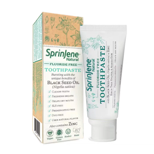 Discover the power of nature with SprinJene Natural's Adult Fluoride-Free toothpaste. Our patented formula, enriched with blackseed oil and zinc and other natural ingredients is designed to help protect enamel, remove surface stains and reduce gum inflammation. You'll love the natural mint and clove flavors that give this toothpaste its great natural taste!