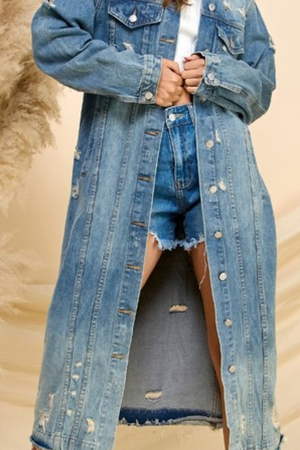 Distressed denim maxi jacket
