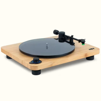Meet the Stir It Up Lux Bluetooth® Turntable. With a replaceable Audio-Technica 95E elliptical stylus and aluminum headshell, this turntable elevates your experience through improved sound quality and tracking ability. The bamboo plinth and glass platter enhance audio performance, while the double-sided cork slipmat adds playful color. With Bluetooth connectivity, an anti-skate mechanism, adjustable counterbalance, and a built-in pre-amp, theStir It Up Lux Bluetooth® Turntable combines epic sound with sustainability.