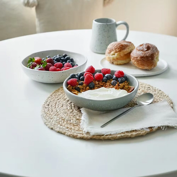 A ceramic collection beautiful enough for guests but durable enough to withstand every day use. The subtle speckled pattern adds visual interest and texture making it the perfect backdrop for all your delicious kitchen creations. Each piece is hand-thrown and unique giving it a beautiful handmade quality. The Edgewater Bowl is the ideal size and shape for your morning bowl of cereal. We also love them for soups, salads, and any other saucy entrees.